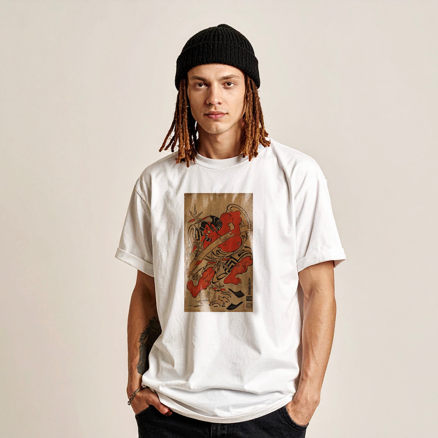This ukiyo-e depicts Ichikawa Danjuro I performing kabuki in 1697. The portrayal is highly stylized to emphasize the character's dramatic presence, employing techniques such as exaggerated musculature in the limbs, legs tapered into gourd-like shapes, and bold, dynamic brushstrokes that convey a sense of movement.
