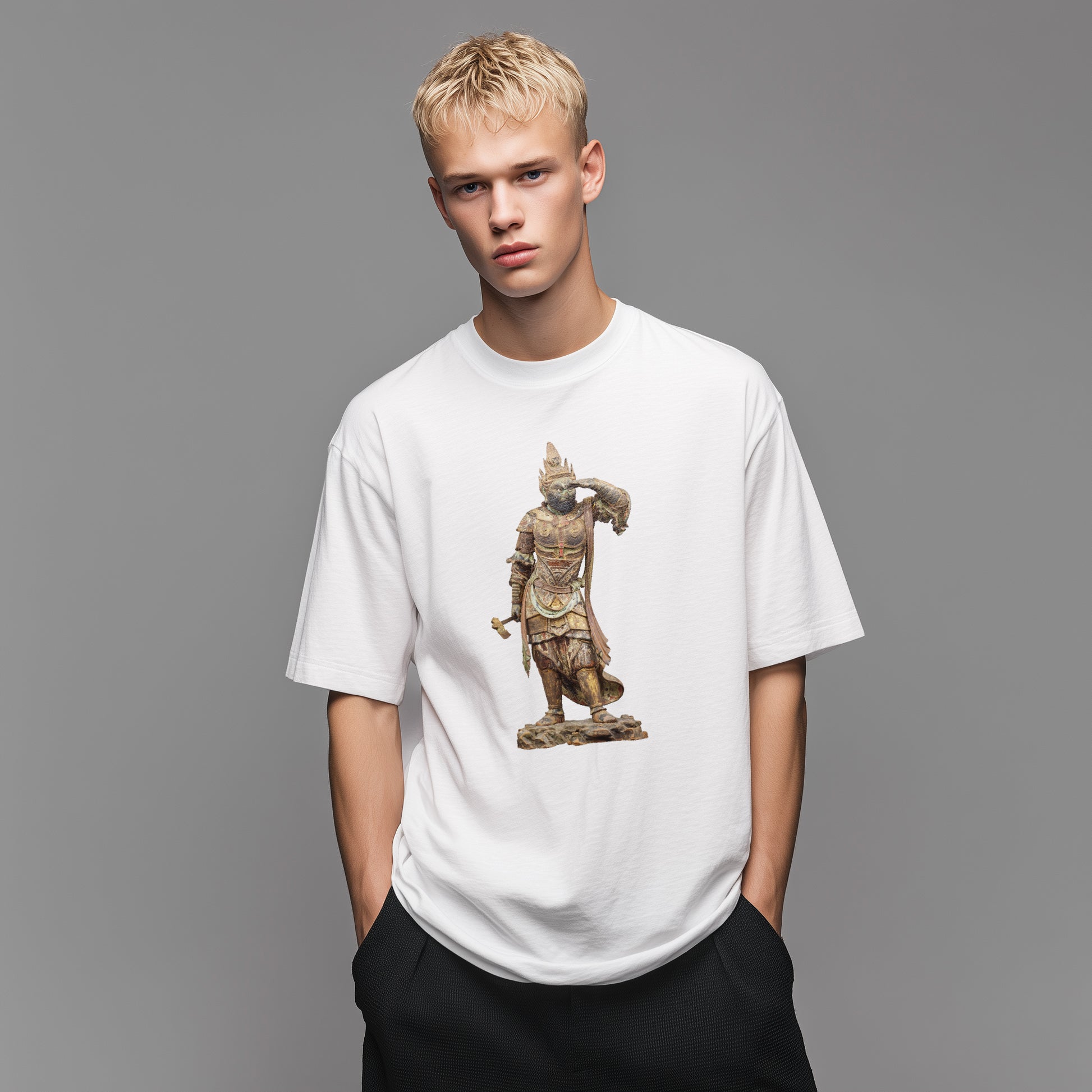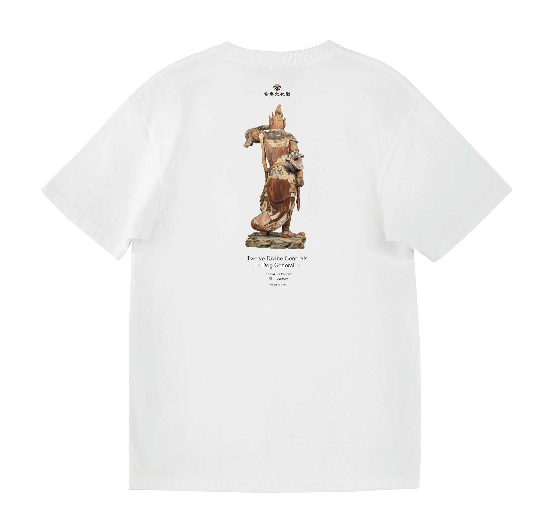 This 13th-century Buddhist statue depicts the "Dog General," one of the Twelve Divine Generals who serve as protectors of "Yakushi Nyorai." In accordance with Yakushi Nyorai's Twelve Vows, each general guards one of the twelve directions, and in China and Japan, they were associated with the twelve animals of the zodiac. The figure features spiked hair with a dog's face visible beneath it. Dressed in Tang-style armor, it holds an axe in its right hand and raises its left hand above its eyes, as if scanning for enemies.