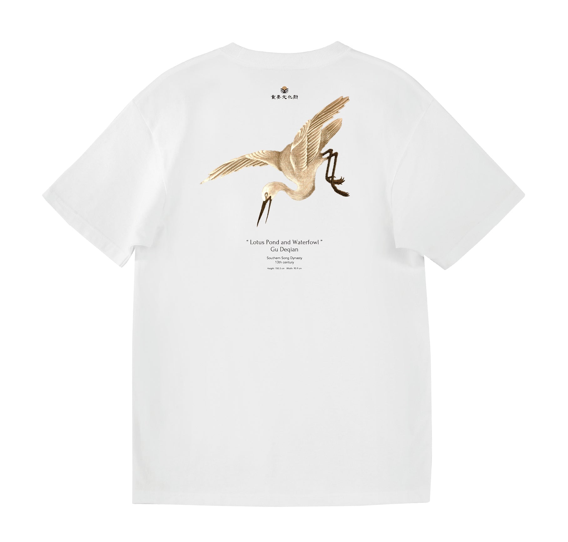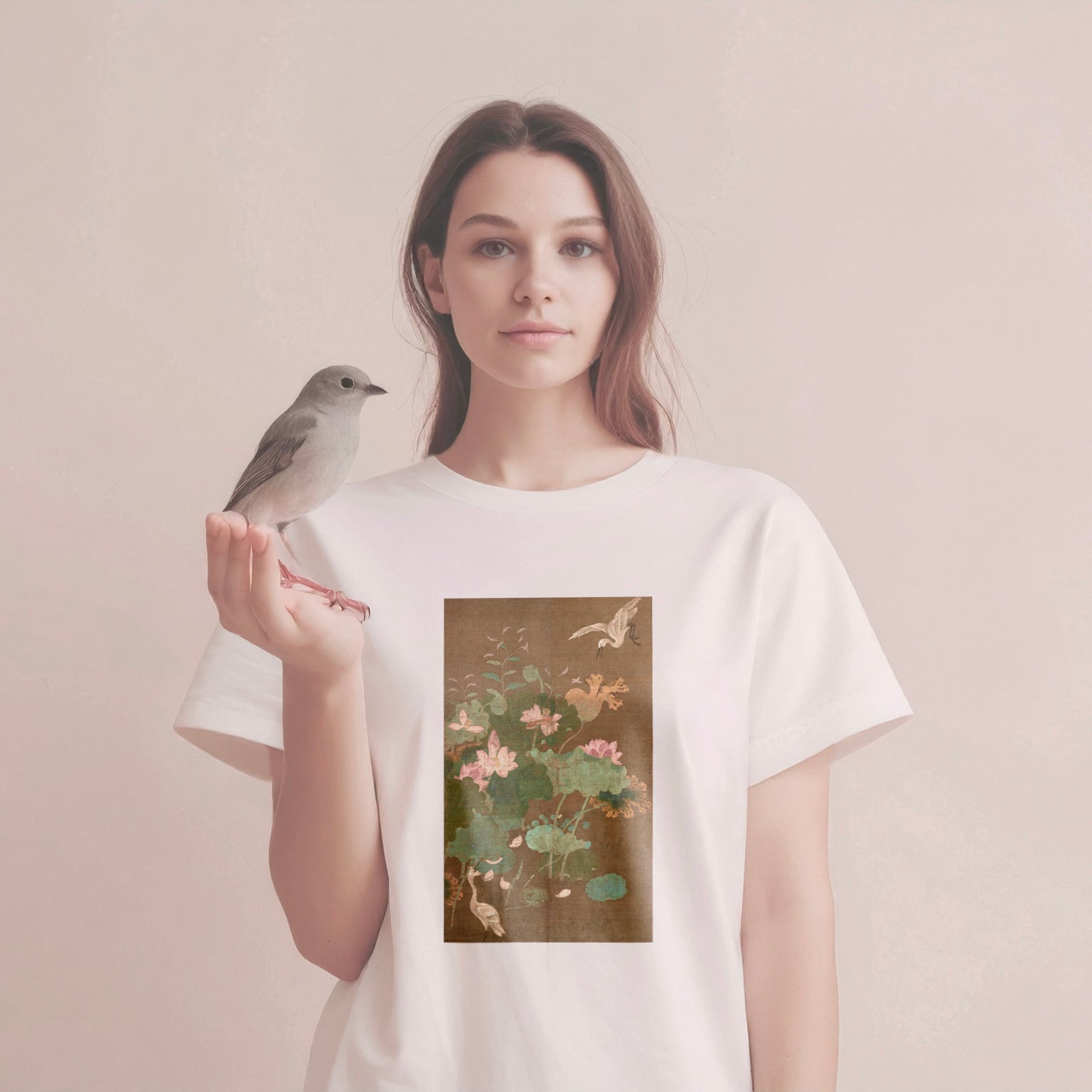 This painting dates to 13th-century Southern Song China. The scene depicts lotuses swaying in the wind as they bloom from buds to full blossoms, contrasted with others quietly standing as their petals fall—expressing the passage of time through the contrast between movement and stillness. The bold, undulating outlines of the lotus leaves and the graceful curves of the birds add a decorative charm, while the brilliant colors and generous brushstrokes evoke a serene and joyful atmosphere.